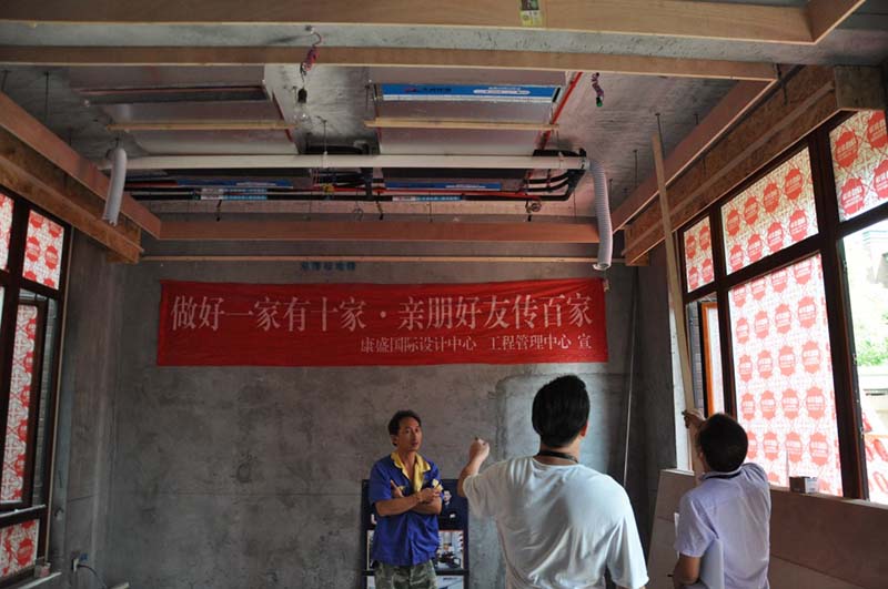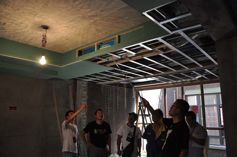 ▲與木工師傅吊頂前期核對工藝